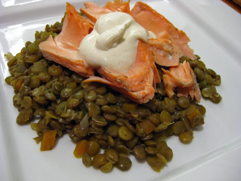 3.19-fish-lentils Published on March 19, 2010 at 1000 × 750 in A Tale of Two Salmon–Part I « Previous Next » Poached salmon on top of a bed of lentils, with a dollop of dijion creme fraiche.