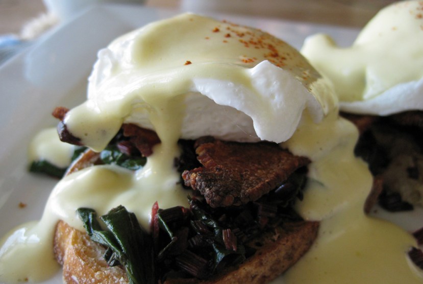 020511-eggs-benny-2 Published on February 5, 2011 at 1000 × 671 in Eggs Benny « Previous Crisp bacon, sauteed chard, and creamy hollandaise sauce in another Eggs Benny brunch.