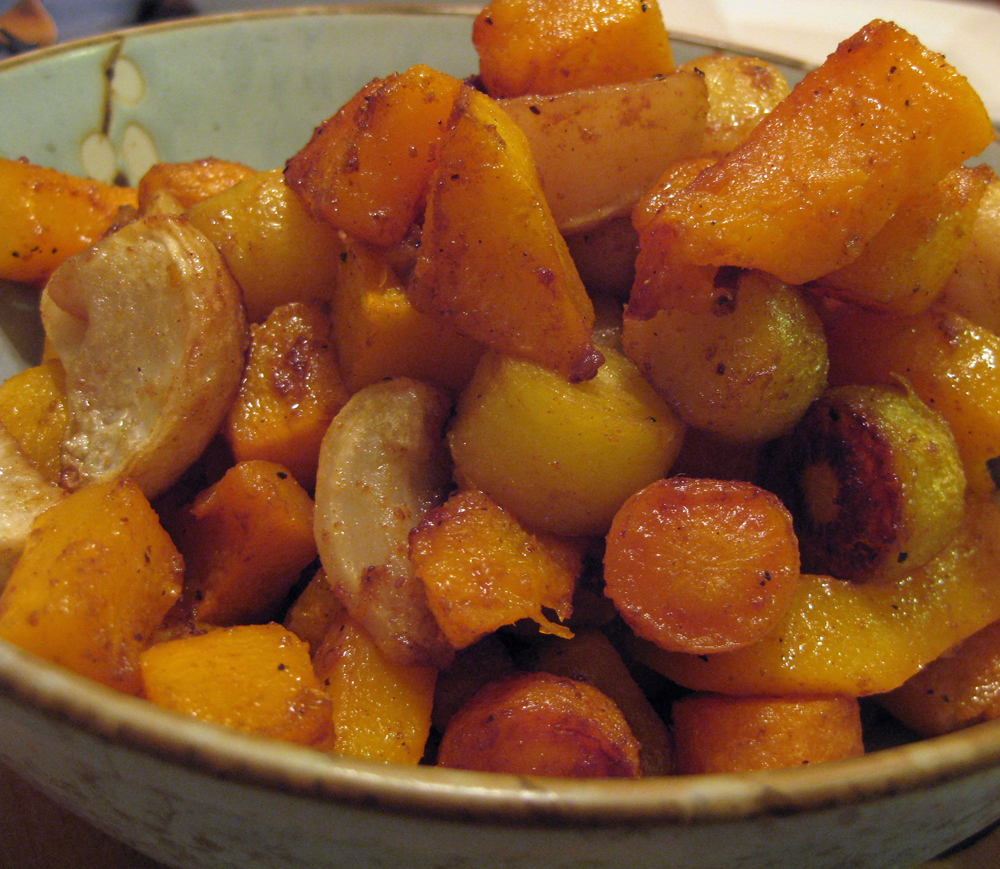 Garam Masala, curry, & honey: Toss the veggies with ½ tablespoon (or more) of each spice and about 2 tablespoons honey, along with olive oil, and salt and pepper.