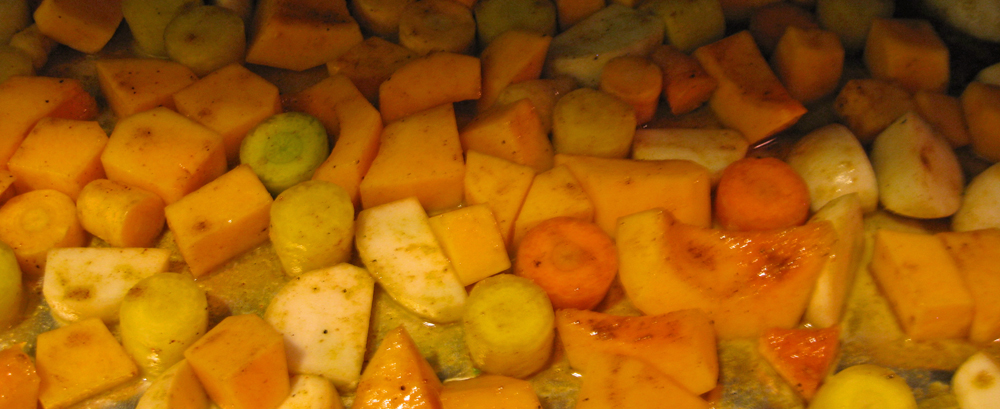 The roasting of the veggies brings out a deep rich flavor and sweetness that pan frying or blanching looses. Great veggies to try include broccoli, sweet potatoes, cabbage, Brussels sprouts, and, of course, the notorious russet potato. We use this technique with hard squash and beets in addition to the veggies already mentioned. An added benefit to cranking up the oven is the warming effect the ambient heat has in a small, freezing apartment.