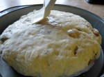 Shape into round loaf and place on a parchment lined cookie sheet. Flatten loaf slightly. Using a sharp knife or razor blade, cut a cross in the top of the loaf. Mix 1 teaspoon Irish Whiskey with remaining buttermilk and brush the top of the unbaked bread with the mixture.