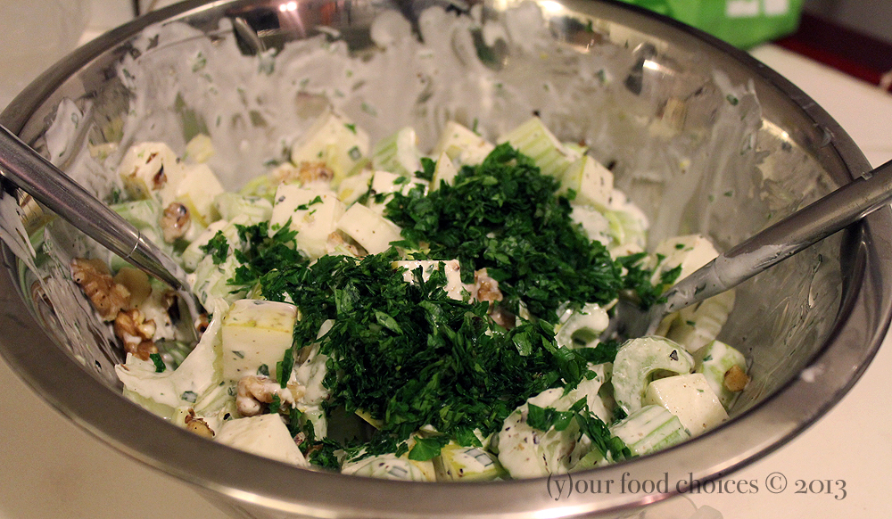 011813IMG_1899 Published on January 18, 2013 at 1000 × 582 in Celery: Braised Celery, Mushrooms, and Leeks; Waldorf Salad; Mean Green Juice « Previous Next » Adding the herbs to the Waldorf Salad.