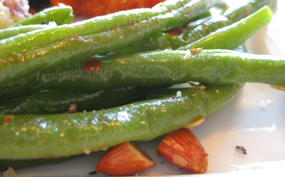 Fill a large pot with water, add a large pinch of salt, and place on the stove over high heat until it boils. While the pot is coming to a boil, fill a large bowl with ice and water. When the water in the pot is boiling, add the green beans and boil for 2 minutes. Remove the beans from the water and immediately plunge them into the ice water to “shock” them and stop the cooking. They will retain their green color. At this point, you can set them aside, or refrigerate up to 1 day, to be finished just minutes before serving.