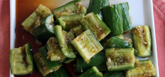 Place the crushed cucumber in a mixing bowl. Add soy sauce, sesame oil and chopped garlic to bowl and gently toss with cucumbers until they’re completely coated with the soy dressing.