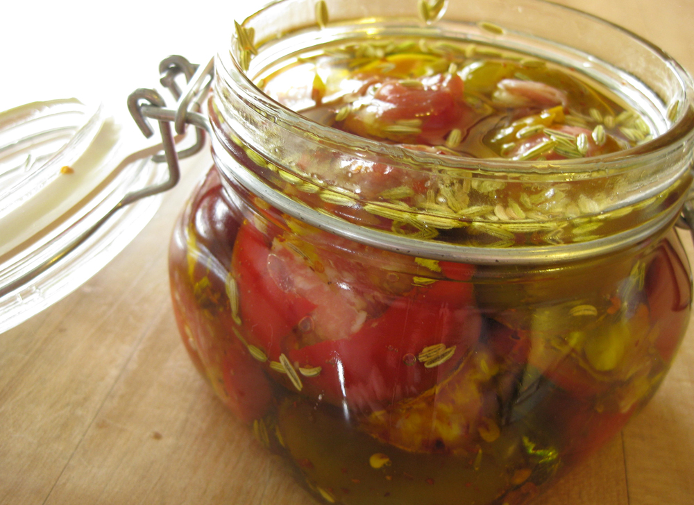 As you eat up the peppers, use the olive oil in salad dressings or as a seasoning for pastas, sandwiches, etc.