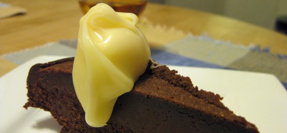 The dark chocolate, pudding-like cake is served with a white chocolate ganache. Both the cake and the ganache are spiked with bourbon, a perfect companion to any chocolate dessert. But if you’re opposed to whisky or alcohol you can omit it from both recipes, or replace the bourbon with a different liquor of your liking. A dark rum would be a great substitute.