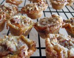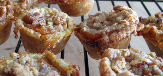 Preheat oven to 325 degrees. Using mini muffin tins; roll out pie dough and, using a round cookie cutter slightly larger than the mini muffin tin, cut out circles. Place the dough in the muffin tins. Pour in buttermilk filling about half full and place a half or a quarter apricot, depending on the size of the fruit, on top of the filling. Top with some almond streusel and bake for about 20-30 minutes.