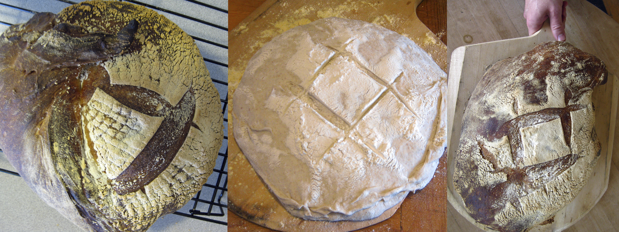 The challenge I’m facing now is in the transferring of the dough from the basket to the peel and then to the oven. With my first loaf of bread I tried something non-traditional in baking: I dusted a lot of corn flour over the bottom of the bread while still in the basket. Next, I placed the peel on top of the basket and then, in one quick swoop, flipped the dough-filled basket over to transfer the dough to the peel and then, with a quick tug of the peel, the dough was in the oven on a heated pizza stone. The only problem was that the bottom of the bread had a lot of flour on it and it just wasn’t crisp enough coming out of the oven. With the subsequent two loaves I’ve tried the traditional method of dusting the peel and then flipping the dough onto the peel and then again sliding the dough from the peel to a pizza stone that has pre-heated in the oven. My first attempt at this method resulted in a fold over of the dough and my next attempt wasn’t much better as the dough oozed over the edge of the stone and between the wires of the oven rack. While both loaves of bread turned out gnarly and twisted they both tasted great.