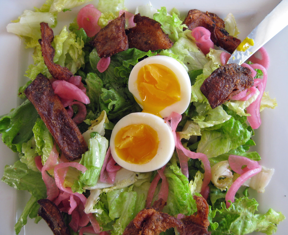 Once we figured out the oil temperature and browning stuff, things moved quickly. We drained the crispy brown pieces on paper towels and sprinkled them with sea salt. Both their texture and flavor were perfect! We ate them over a lightly dressed salad of green leaf lettuce along with some thinly sliced pickled red onion. A soft-boiled egg nestled on top completes the dish.